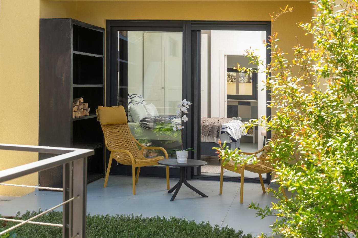 Guests can relax near the outdoor fireplace at the holiday home.