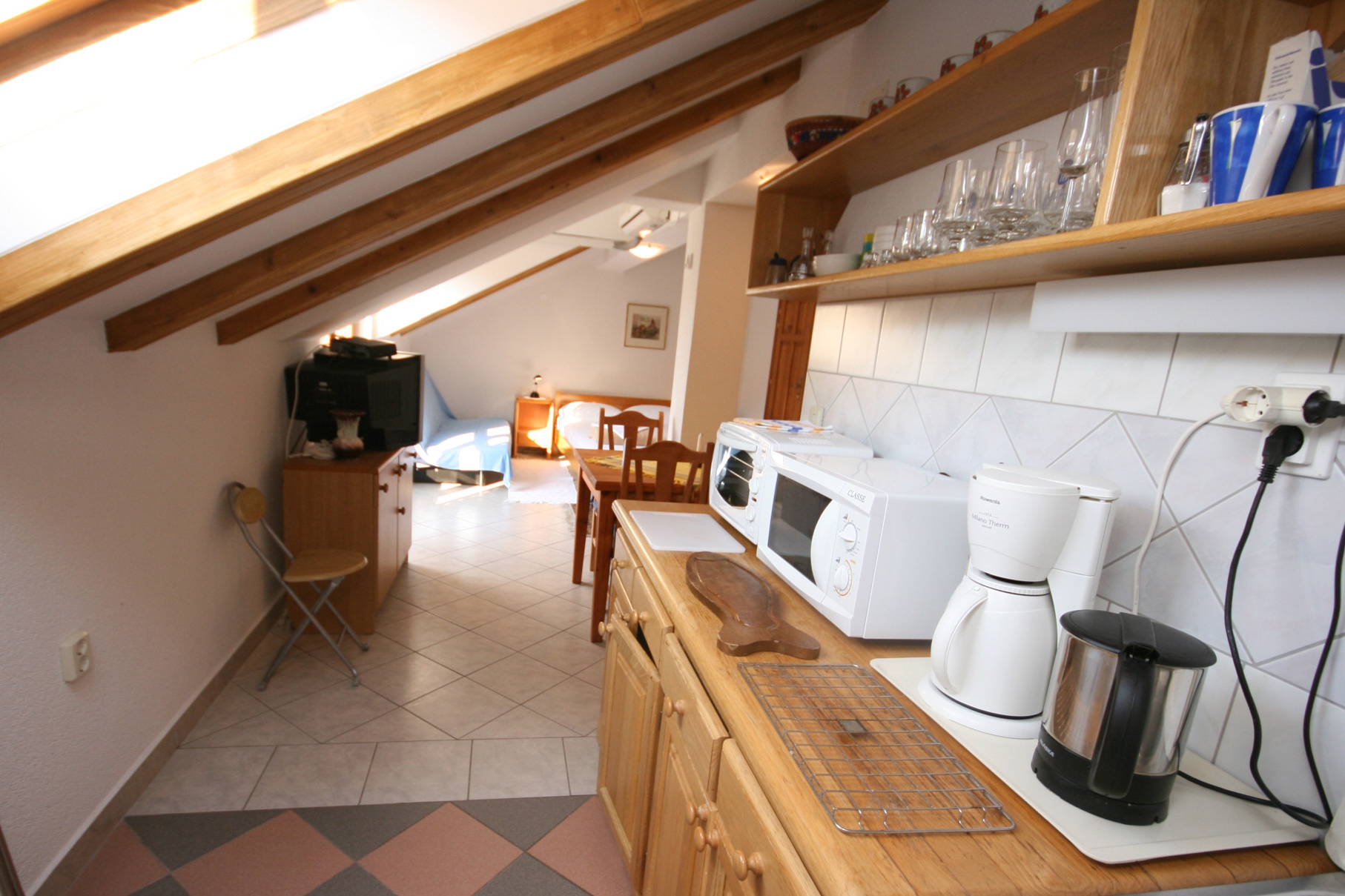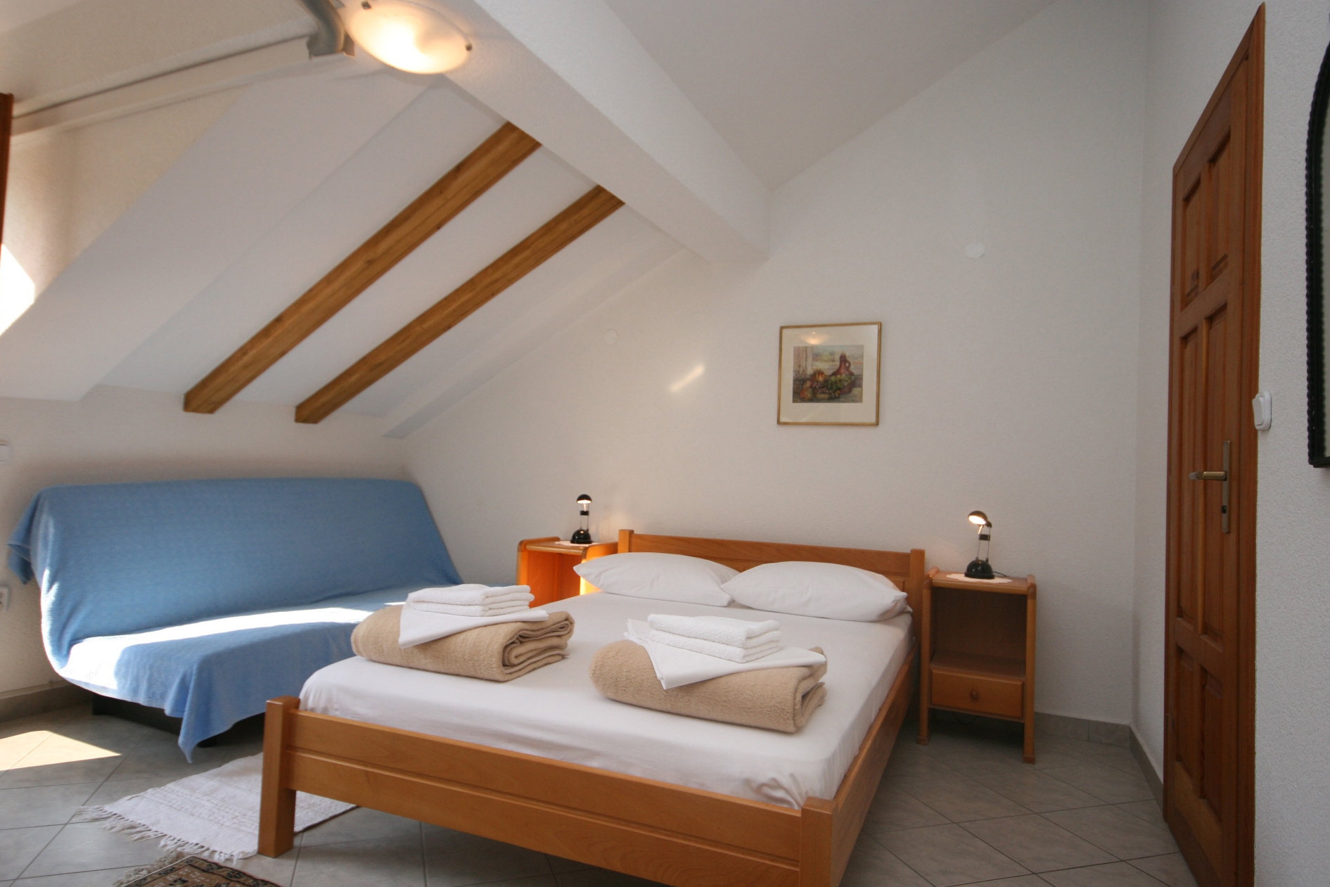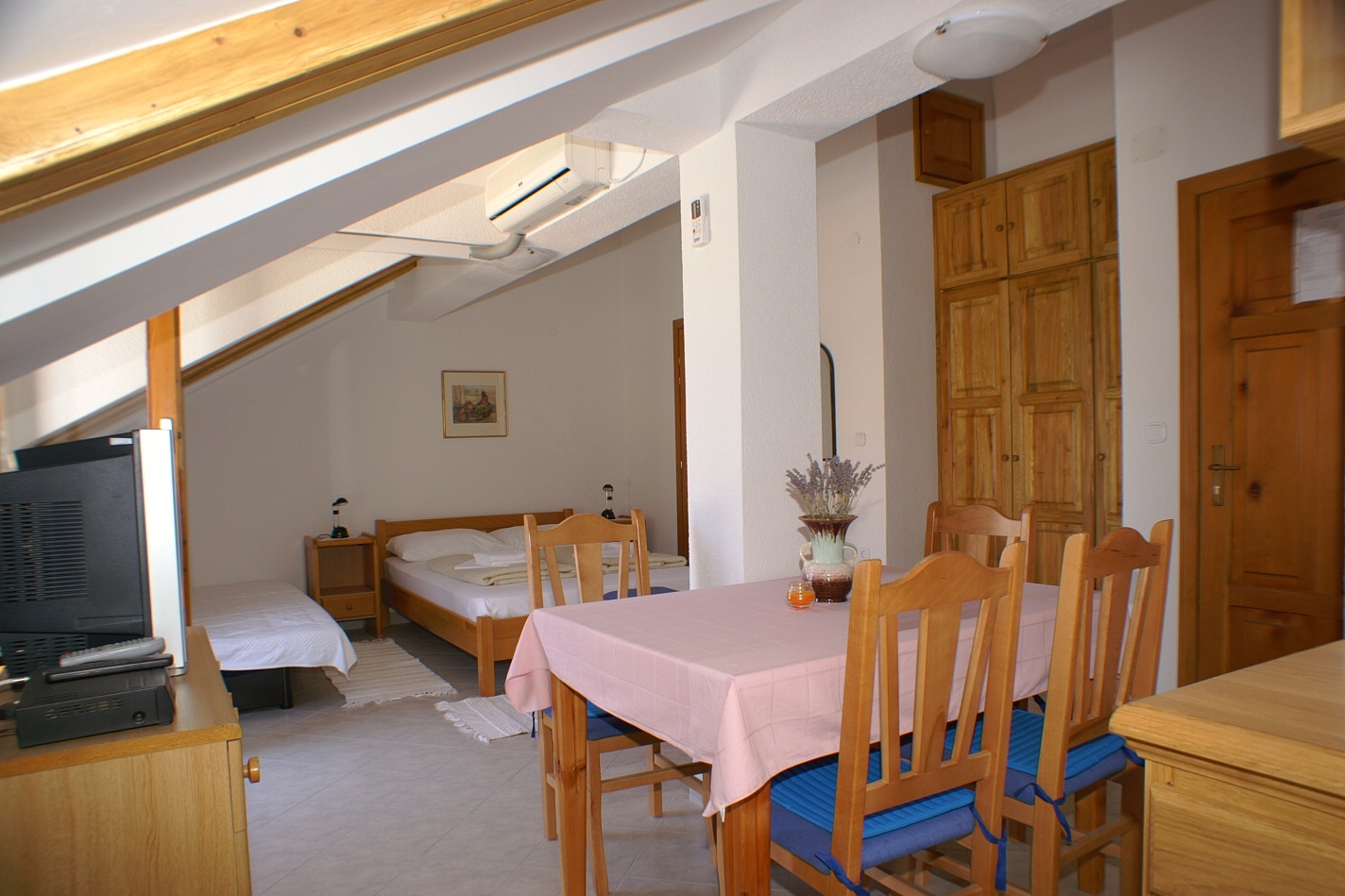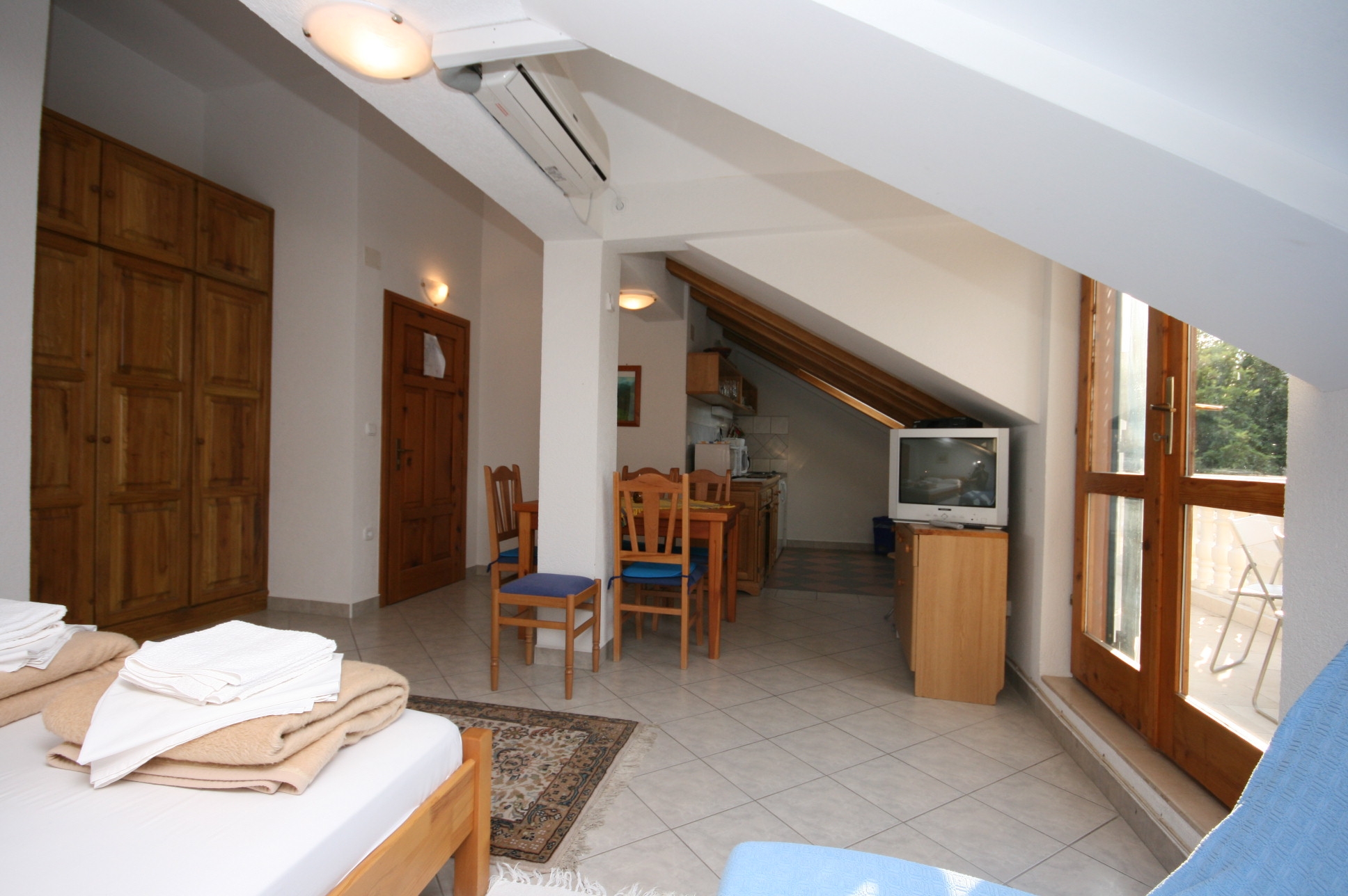 Studio flat can accommodate 4 guests. Beds are situated in 1 sleeping rooms, within 31m2. Guests can use a private terrace to enjoy the warm summer evenings. This accommodation unit welcomes pets at an additional charge. INCLUDED IN THE PRICE: tourist tax, final cleaning, air-conditioning, parking, internet, baby cot, iron, ironing board, hairdryer. OBLIGATORY ADDITIONAL COSTS: short stay fee (surcharge depending on a number of booked nights: 30% - 1, 20% - 2, 10% - 3). OPTIONAL ADDITIONAL COSTS: laundry (€5.00 washing), boat mooring (€3.00 per night), pets (€5.00 per night). The availability of additional services for your chosen dates of stay, as well as their prices (if none are listed) must be checked ahead of time. Any additional services not shown in the price calculation are payable directly to the property owner and only if used by the visitor.