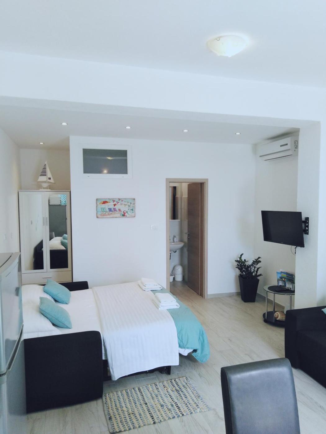 Family Studio. Providing free toiletries, this studio includes a private bathroom with a shower and a hairdryer. Guests can make meals in the kitchen that is equipped with a stovetop, a refrigerator, kitchenware and a microwave. The air-conditioned studio provides a flat-screen TV with satellite channels, a private entrance, a tea and coffee maker, a seating area as well as sea views. The unit offers 2 beds. ;