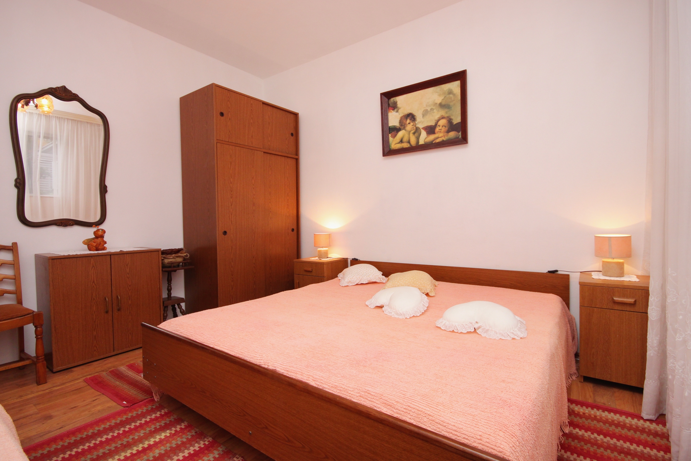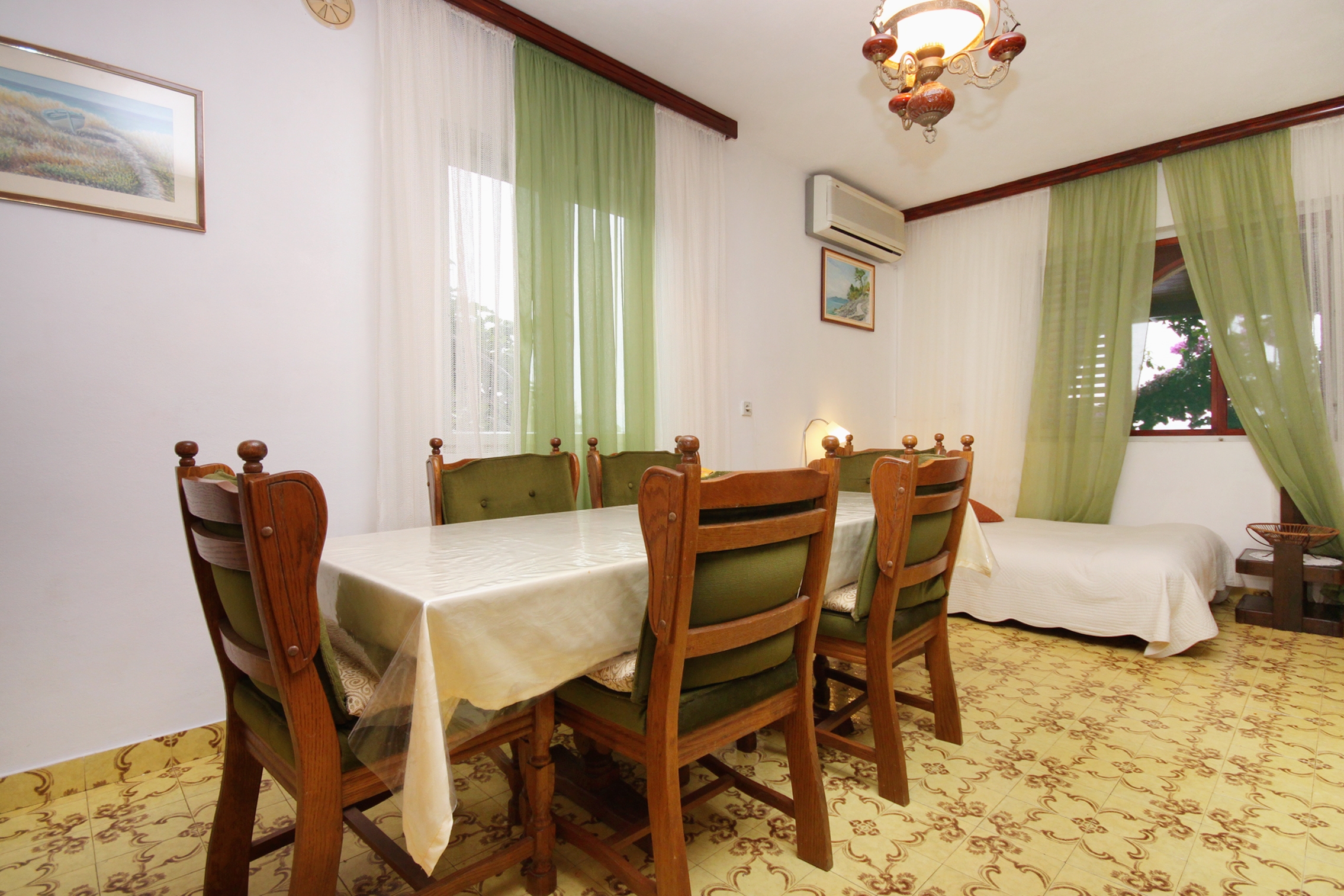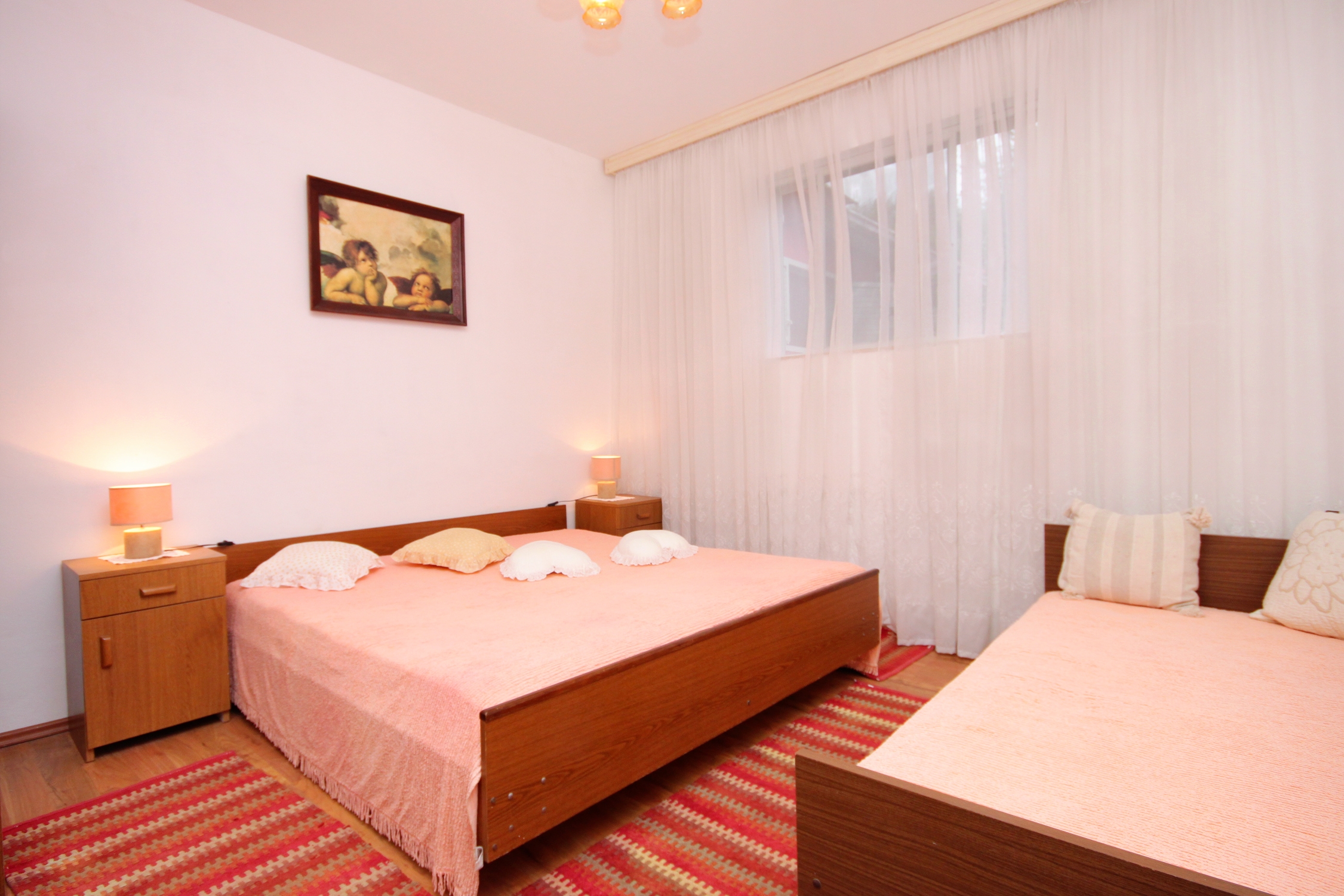 Apartment can accommodate 6 guests. Beds are situated in 2 sleeping rooms, but also in the dining room, within 51m2. Guests can use a private terrace to enjoy the warm summer evenings. The apartment offers the sea view. Food can be prepared using barbecue which is shared with other guests too. INCLUDED IN THE PRICE: tourist tax, final cleaning, air-conditioning, parking, internet, iron, ironing board, hairdryer, sunchairs. OBLIGATORY ADDITIONAL COSTS: short stay fee (surcharge depending on a number of booked nights: 30% - 1, 20% - 2, 10% - 3). OPTIONAL ADDITIONAL COSTS: additional bed (€10.00 per night). The availability of additional services for your chosen dates of stay, as well as their prices (if none are listed) must be checked ahead of time. Any additional services not shown in the price calculation are payable directly to the property owner and only if used by the visitor.