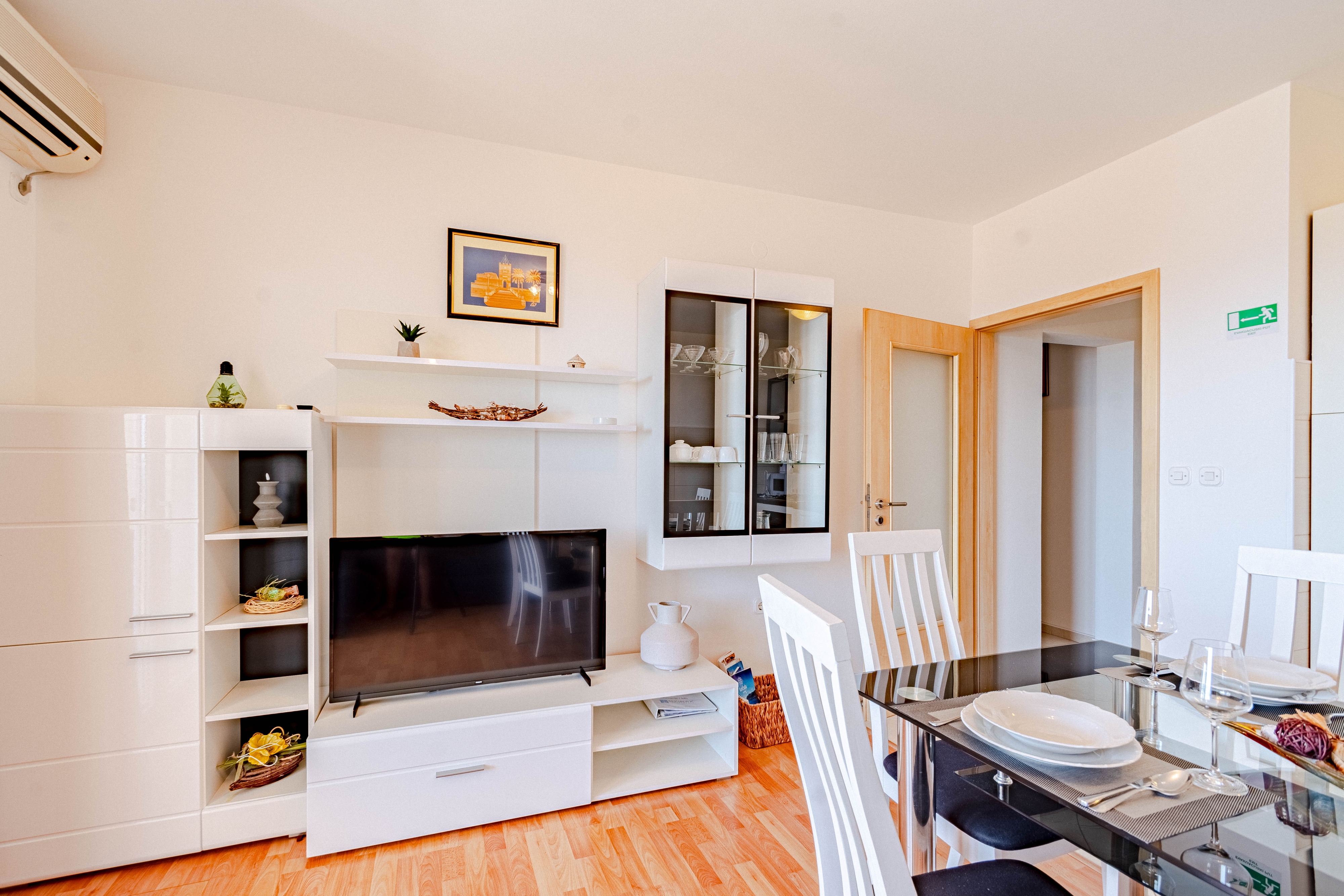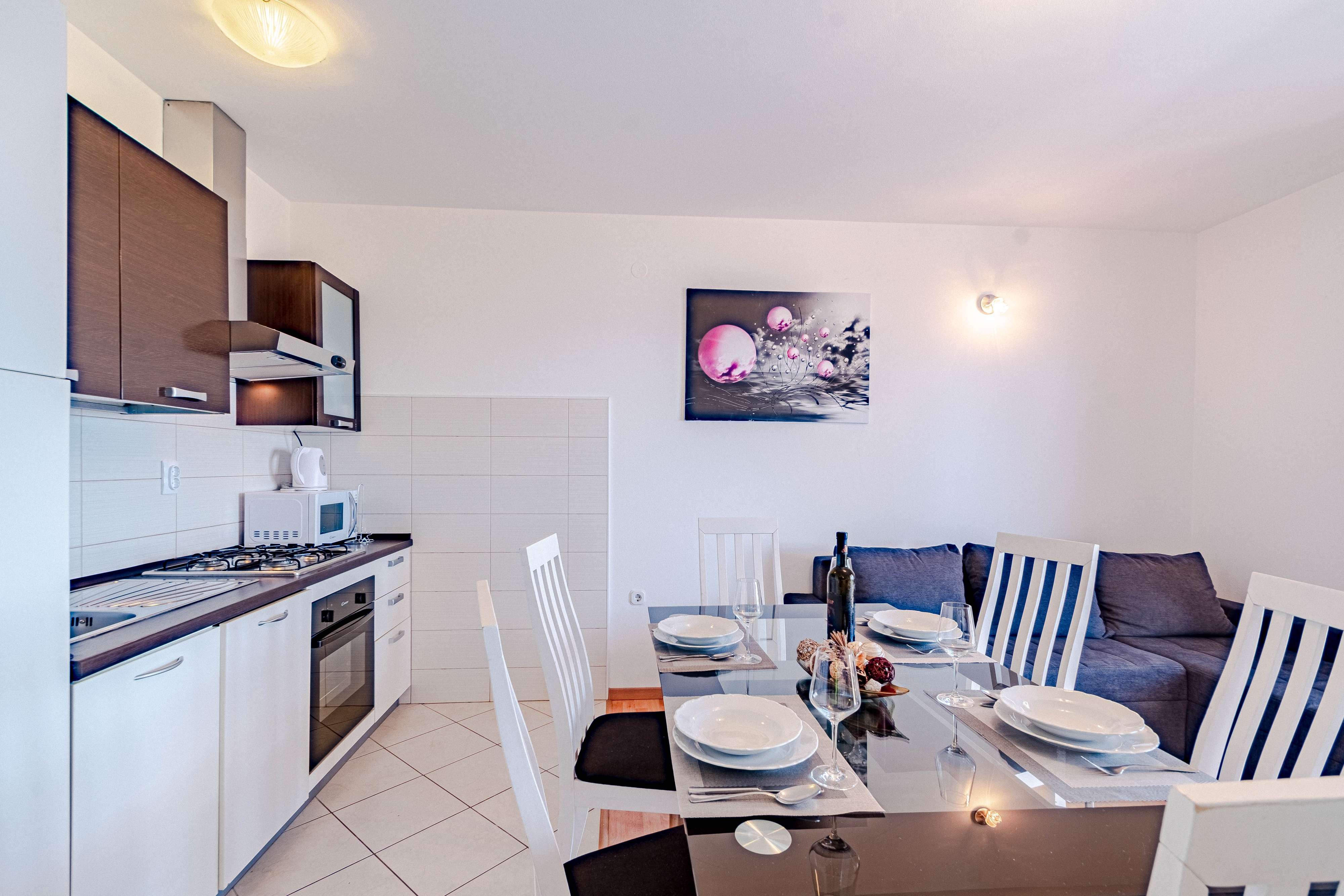 Apartment can accommodate 6 guests. Beds are situated in 2 sleeping rooms, but also in the living room, within 56m2. Guests can use a private terrace to enjoy the warm summer evenings. The apartment offers the sea view. Food can be prepared using barbecue which is shared with other guests too. Shared pool is on disposal during stay. For the booked accommodation unit the deposit is paid directly to the owner upon check-in (deposit amount is displayed on the website) INCLUDED IN THE PRICE: tourist tax, final cleaning, air-conditioning, pool, parking, internet, baby cot, iron, ironing board, hairdryer. OBLIGATORY ADDITIONAL COSTS: deposit (€50.00 one-time payment). The availability of additional services for your chosen dates of stay, as well as their prices (if none are listed) must be checked ahead of time. Any additional services not shown in the price calculation are payable directly to the property owner and only if used by the visitor. Discounts to the base price: free day 14=13 (for reservations of 14 or more days you get one free day for the stay until 31122026).