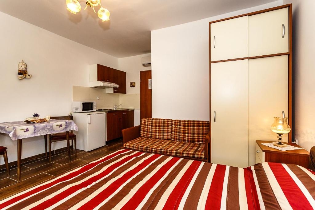 Studio flat can accommodate 3 guests. Beds are situated in 1 sleeping rooms, within 24m2. Food can be prepared using barbecue which is shared with other guests too. Reserved accommodation unit has a shared terrace. INCLUDED IN THE PRICE: tourist tax, final cleaning, air-conditioning, parking, internet, baby cot, iron, ironing board, hairdryer, sunshade. OBLIGATORY ADDITIONAL COSTS: short stay fee (surcharge depending on a number of booked nights: 30% - 1, 20% - 2, 10% - 3). The availability of additional services for your chosen dates of stay, as well as their prices (if none are listed) must be checked ahead of time. Any additional services not shown in the price calculation are payable directly to the property owner and only if used by the visitor.