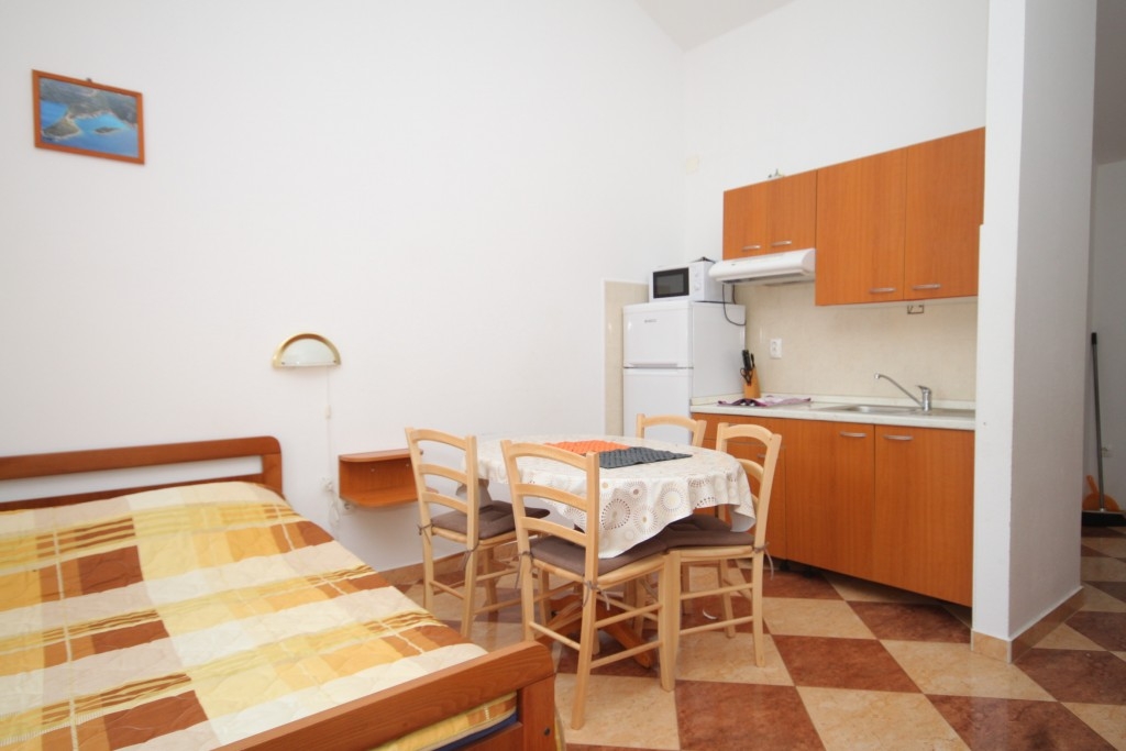 Studio flat can accommodate 2 guests. Beds are situated in living room, within 26m2. Guests can use a private terrace to enjoy the warm summer evenings. The studio offers the sea view. Food can be prepared using barbecue which is shared with other guests too. INCLUDED IN THE PRICE: tourist tax, final cleaning, air-conditioning, parking, internet, boat mooring, additional bed, iron, ironing board, hairdryer, sunchairs. OPTIONAL ADDITIONAL COSTS: laundry (€10.00 washing). The availability of additional services for your chosen dates of stay, as well as their prices (if none are listed) must be checked ahead of time. Any additional services not shown in the price calculation are payable directly to the property owner and only if used by the visitor.