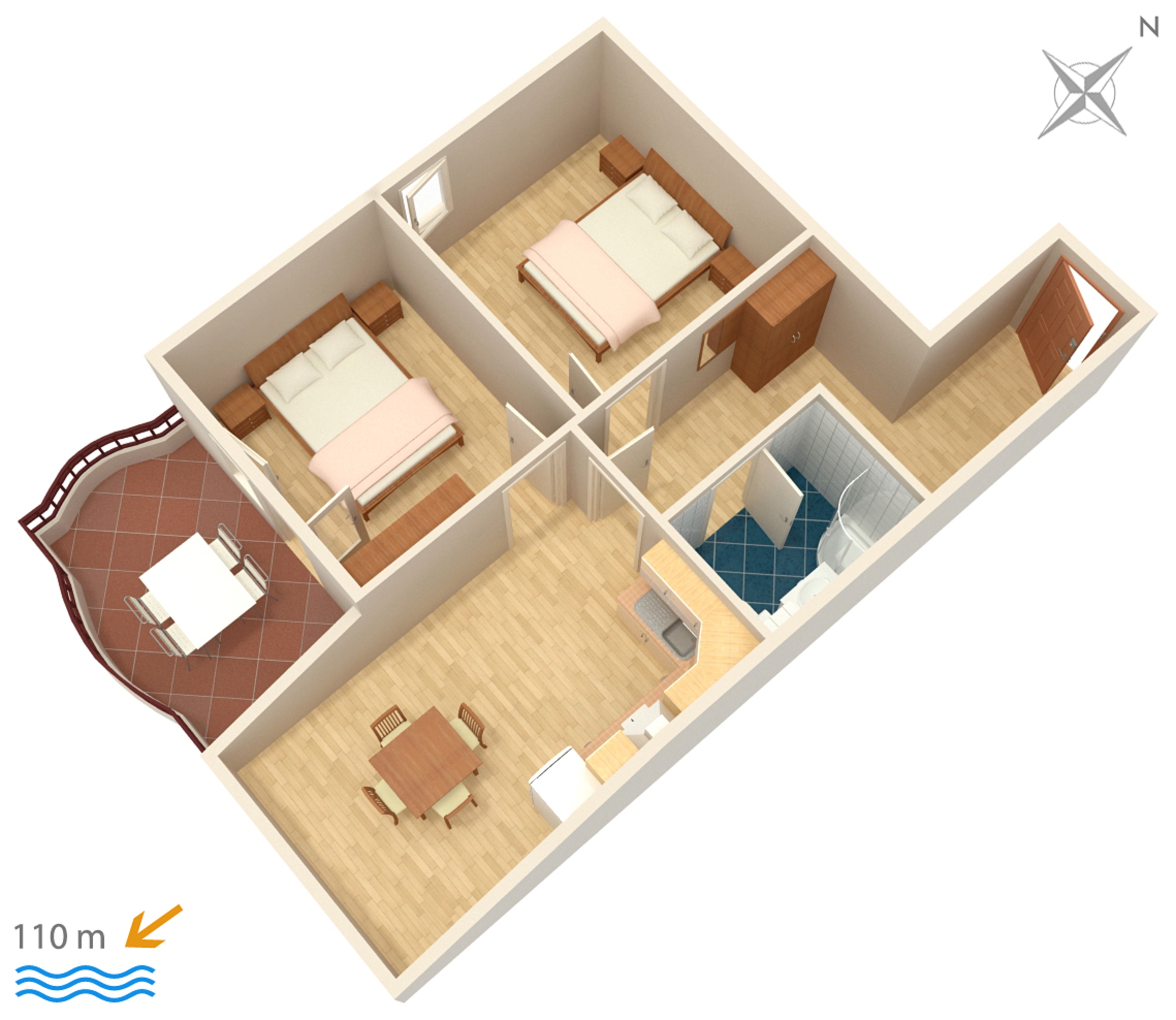 Apartment can accommodate 4 guests. Beds are situated in 2 sleeping rooms, within 53m2. Guests can use a private balcony to enjoy the warm summer evenings. The apartment offers the sea view. INCLUDED IN THE PRICE: tourist tax, final cleaning, air-conditioning, parking, garage, internet, iron, ironing board, hairdryer. OPTIONAL ADDITIONAL COSTS: laundry (€10.00 washing), additional bed (€15.00 per night). The availability of additional services for your chosen dates of stay, as well as their prices (if none are listed) must be checked ahead of time. Any additional services not shown in the price calculation are payable directly to the property owner and only if used by the visitor.