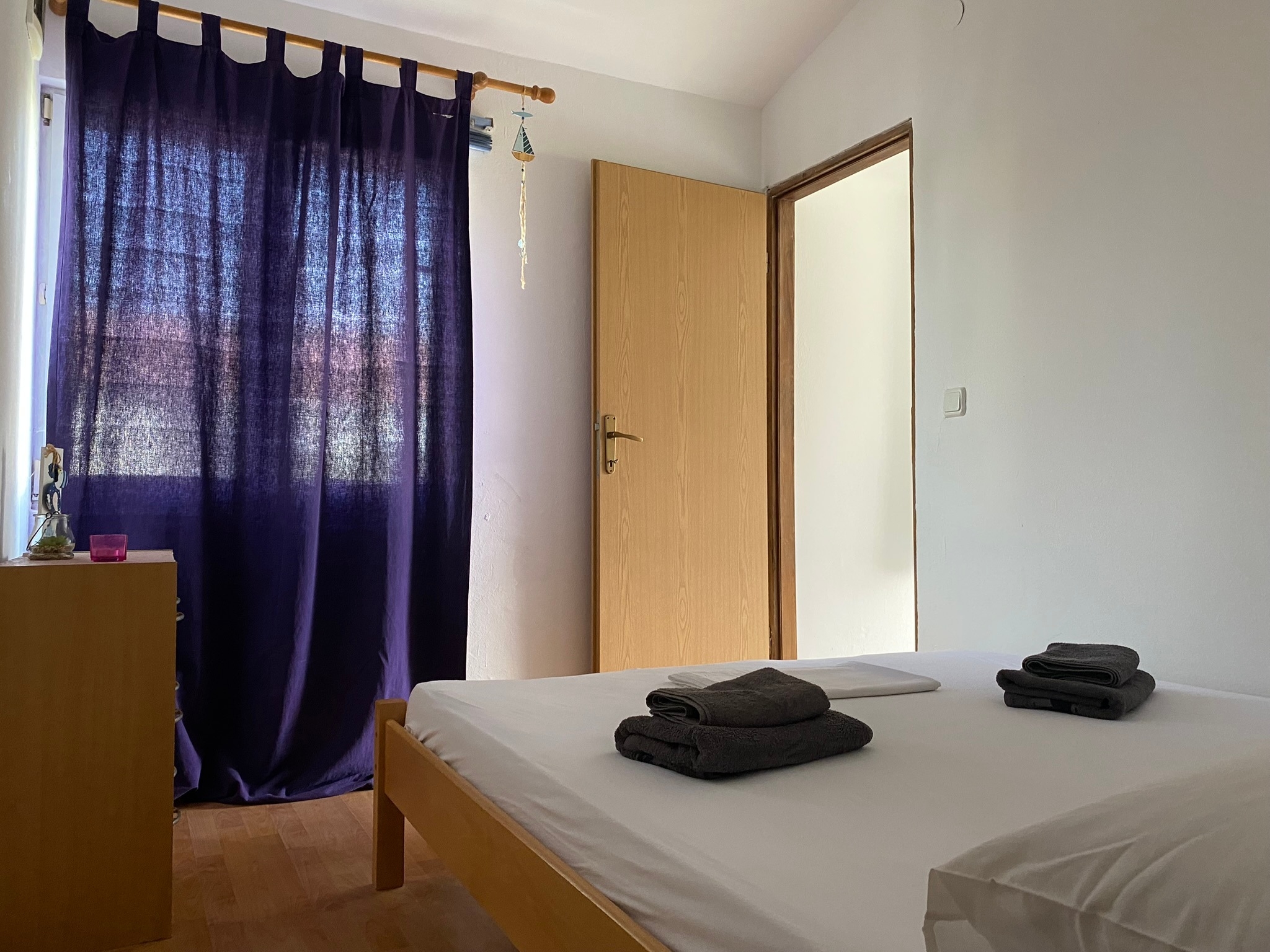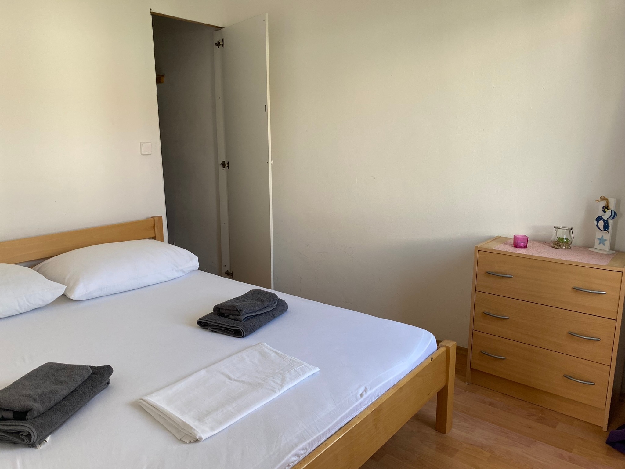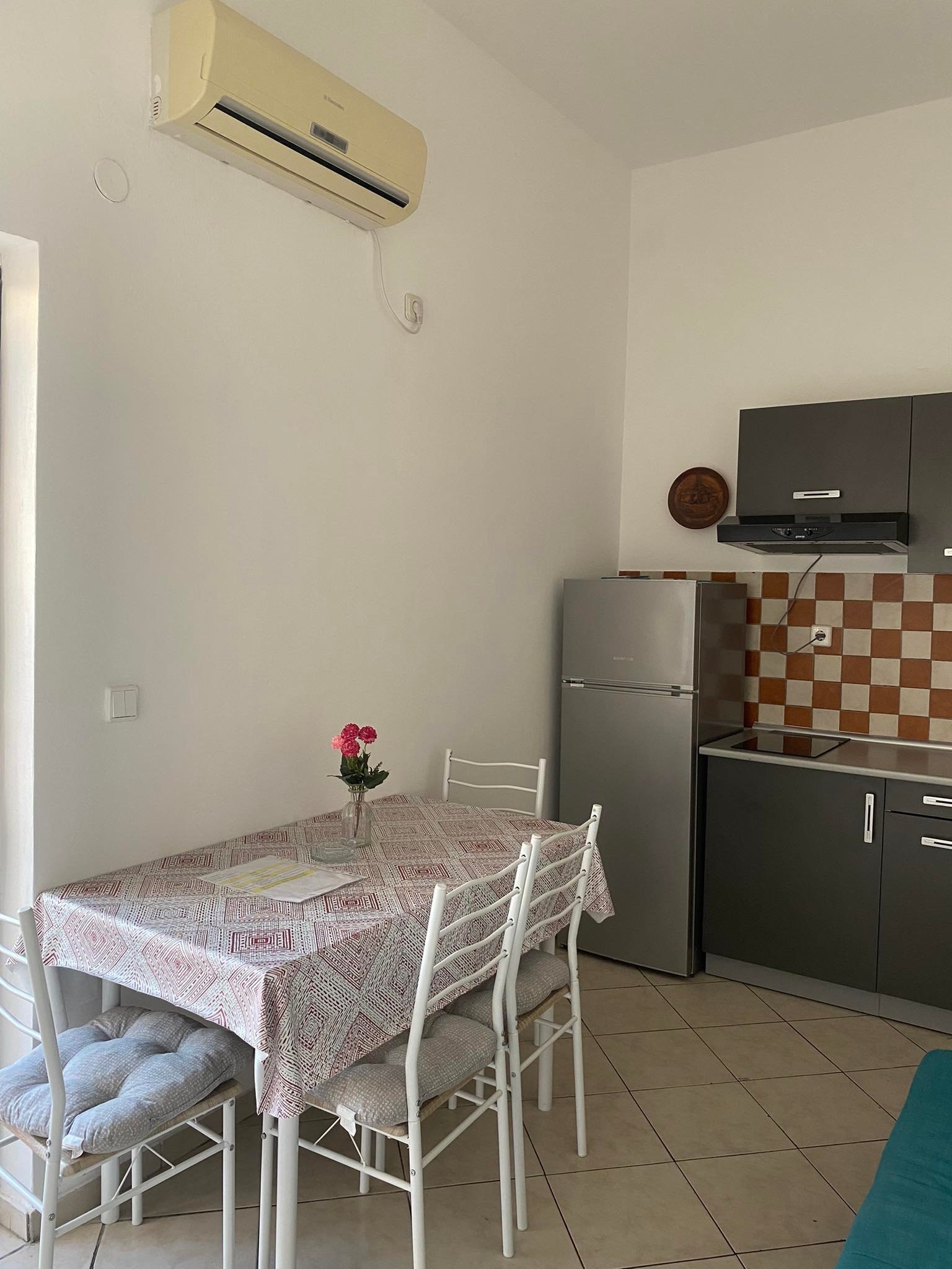 Apartment can accommodate 3 guests. Beds are situated in 1 sleeping rooms, but also in the living room, within 24m2. Guests can use a private balcony to enjoy the warm summer evenings. This accommodation unit welcomes pets at an additional charge. INCLUDED IN THE PRICE: tourist tax, final cleaning, air-conditioning, parking, internet, iron, hairdryer, sunchairs. OBLIGATORY ADDITIONAL COSTS: short stay fee (surcharge depending on a number of booked nights: 30% - 1, 20% - 2, 10% - 3). OPTIONAL ADDITIONAL COSTS: boat (€30.00 per night), boat mooring (€10.00 per night), pets (€5.00 per night). The availability of additional services for your chosen dates of stay, as well as their prices (if none are listed) must be checked ahead of time. Any additional services not shown in the price calculation are payable directly to the property owner and only if used by the visitor. Discounts to the base price: free day 14=13 (for reservations of 14 or more days you get one free day for the stay until 31122026).
