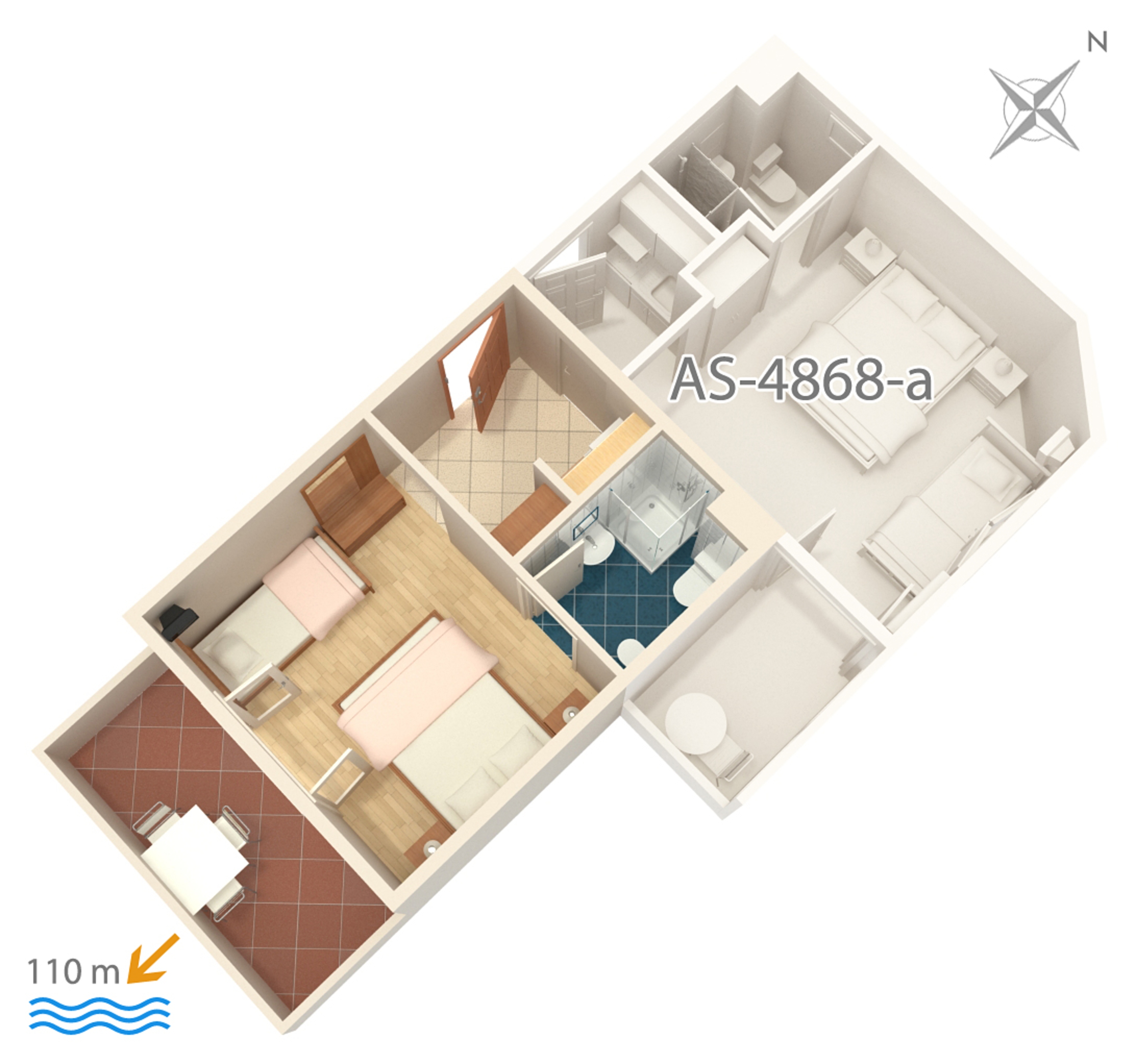Studio flat can accommodate 3 guests. Beds are situated in 1 sleeping rooms, within 21m2. Guests can use a private terrace to enjoy the warm summer evenings. The studio offers the sea view. Food can be prepared using barbecue which is shared with other guests too. INCLUDED IN THE PRICE: tourist tax, final cleaning, air-conditioning, parking, internet, laundry, iron, ironing board, hairdryer. OBLIGATORY ADDITIONAL COSTS: short stay fee (surcharge depending on a number of booked nights: 30% - 1, 20% - 2, 10% - 3). The availability of additional services for your chosen dates of stay, as well as their prices (if none are listed) must be checked ahead of time. Any additional services not shown in the price calculation are payable directly to the property owner and only if used by the visitor.