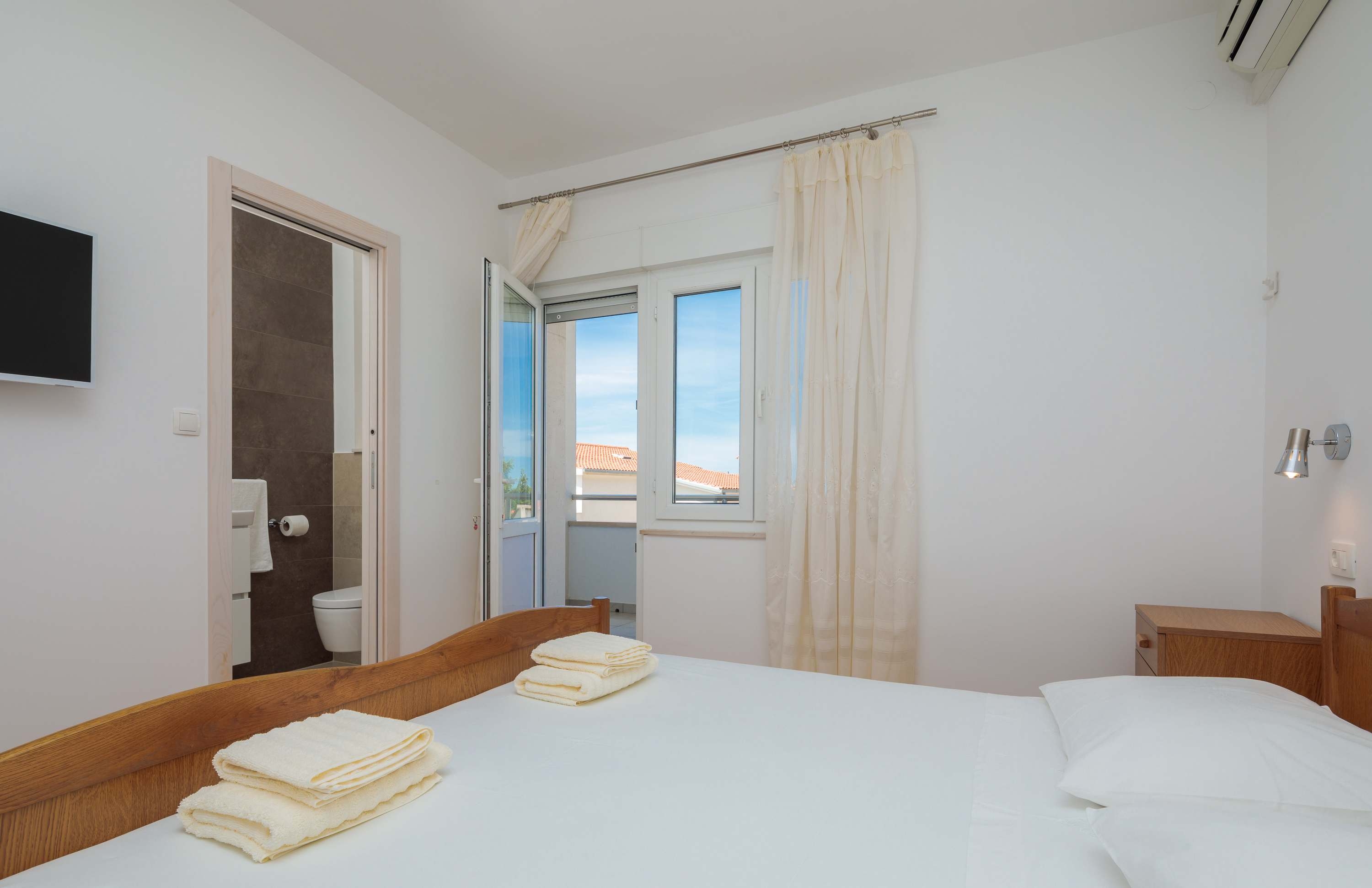 Apartment can accommodate 5 guests. Beds are situated in 2 sleeping rooms, within 45m2. Guests can use a private terrace to enjoy the warm summer evenings. The apartment offers the sea view. INCLUDED IN THE PRICE: tourist tax, final cleaning, parking, internet, baby cot. OBLIGATORY ADDITIONAL COSTS: short stay fee (surcharge depending on a number of booked nights: 30% - 1, 20% - 2, 10% - 3). OPTIONAL ADDITIONAL COSTS: air-conditioning (€0.50 per hour). The availability of additional services for your chosen dates of stay, as well as their prices (if none are listed) must be checked ahead of time. Any additional services not shown in the price calculation are payable directly to the property owner and only if used by the visitor.