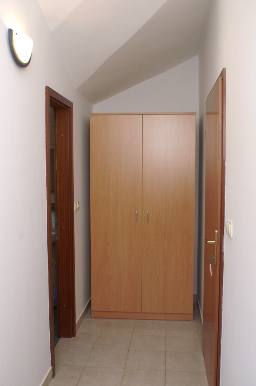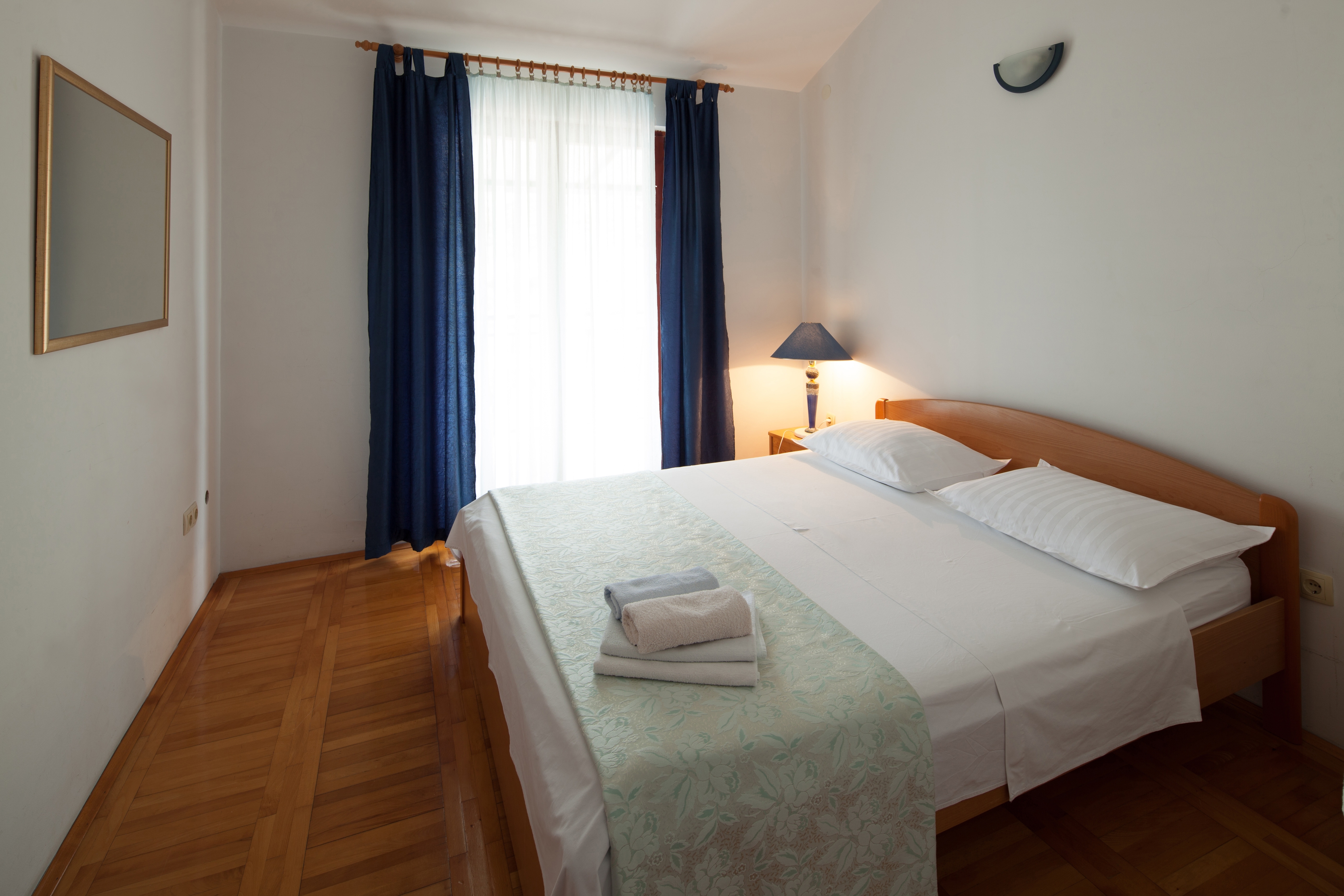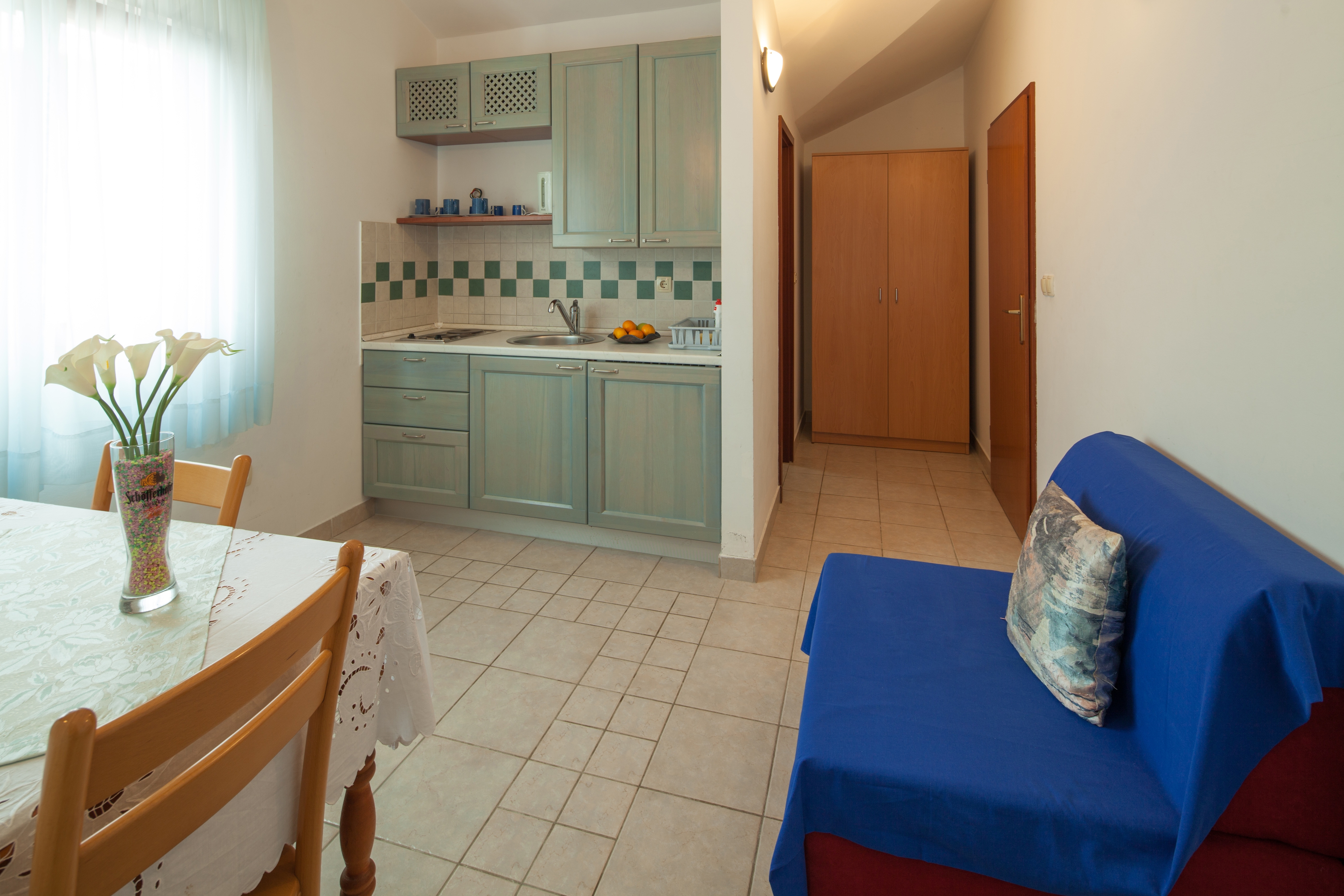 Apartment can accommodate 3 guests. Beds are situated in 1 sleeping rooms, but also in the dining room, within 26m2. Guests can use a private terrace to enjoy the warm summer evenings. The apartment offers the sea view. Food can be prepared using barbecue which is shared with other guests too. This accommodation unit welcomes pets at an additional charge. INCLUDED IN THE PRICE: tourist tax, final cleaning, parking, garage, internet, baby cot, iron, ironing board, hairdryer, sunchairs. OBLIGATORY ADDITIONAL COSTS: short stay fee (surcharge depending on a number of booked nights: 30% - 1, 20% - 2, 10% - 3). OPTIONAL ADDITIONAL COSTS: breakfast (€10.00, a 50% discount for children aged 4 to 12 years, Children up to age 4 free of charge), air-conditioning (€7.00 per night), laundry (€5.00 washing), pets (€7.00 per night). The availability of additional services for your chosen dates of stay, as well as their prices (if none are listed) must be checked ahead of time. Any additional services not shown in the price calculation are payable directly to the property owner and only if used by the visitor.