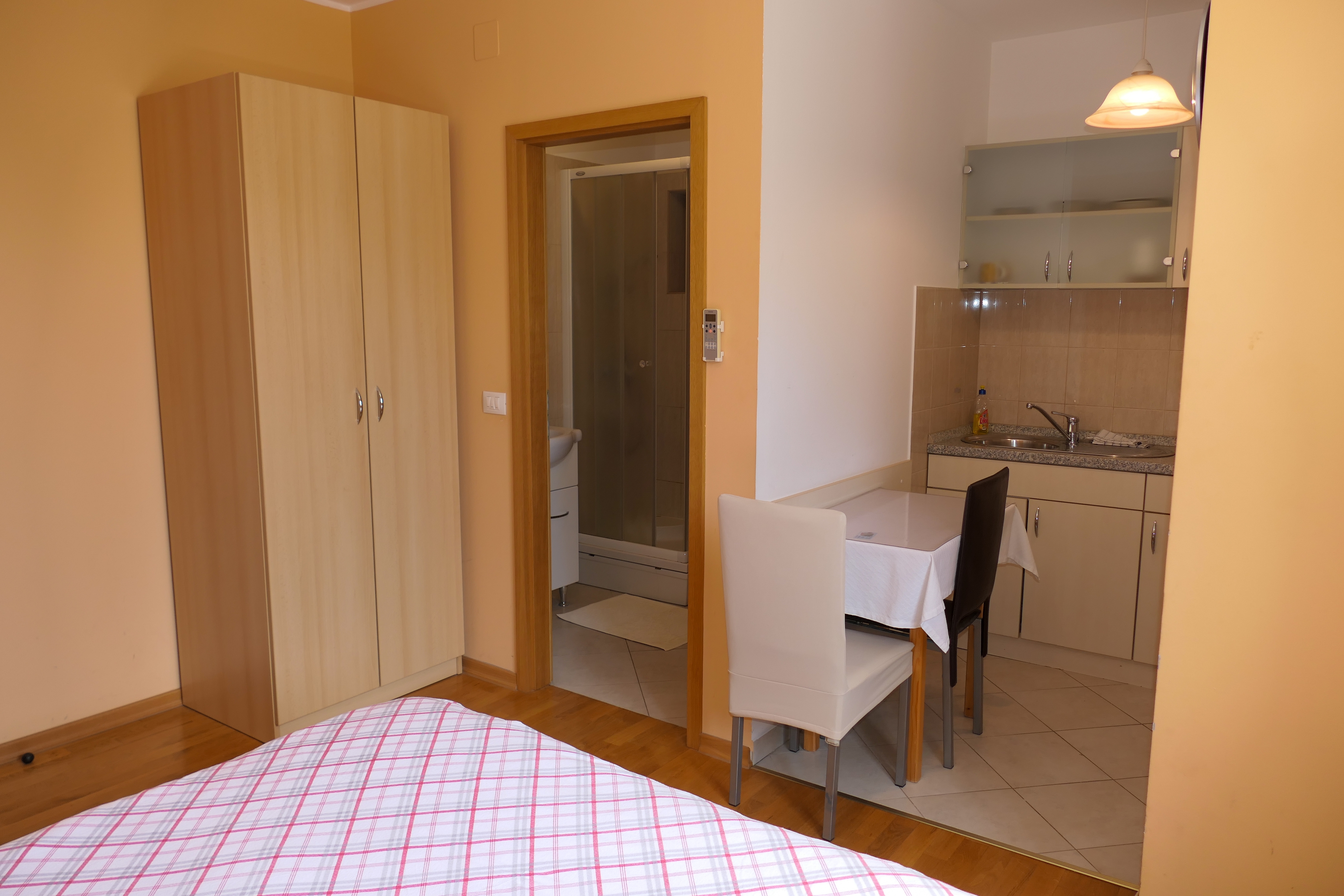 Studio flat can accommodate 2 guests. Beds are situated in 1 sleeping rooms, within 19m2. Food can be prepared using barbecue which is shared with other guests too. There is no balcony or terrace in the reserved accommodation unit. INCLUDED IN THE PRICE: tourist tax, final cleaning, parking, internet, baby cot, iron, ironing board, hairdryer. OBLIGATORY ADDITIONAL COSTS: short stay fee (surcharge depending on a number of booked nights: 30% - 1, 20% - 2, 10% - 3). OPTIONAL ADDITIONAL COSTS: air-conditioning (€5.00 per night), laundry (€3.00 washing). The availability of additional services for your chosen dates of stay, as well as their prices (if none are listed) must be checked ahead of time. Any additional services not shown in the price calculation are payable directly to the property owner and only if used by the visitor.