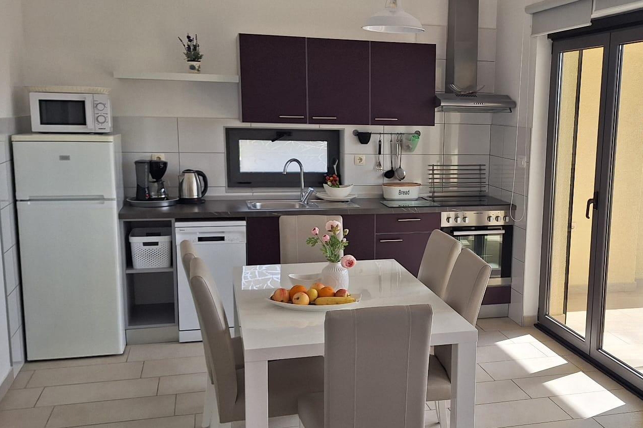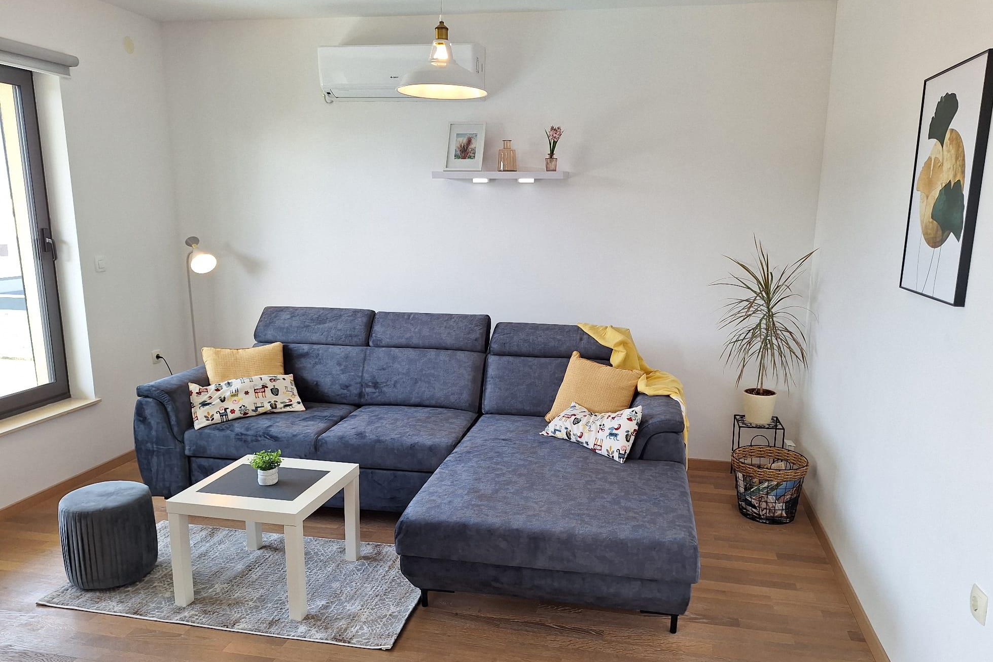 Apartment can accommodate 5 guests. Beds are situated in 2 sleeping rooms, but also in the living room, within 63m2. Guests can use a private terrace to enjoy the warm summer evenings. The apartment offers the sea view. Food can be prepared using barbecue which is shared with other guests too. Shared pool is on disposal during stay. INCLUDED IN THE PRICE: tourist tax, final cleaning, air-conditioning, pool, parking, internet, baby cot, iron, ironing board, hairdryer. The availability of additional services for your chosen dates of stay, as well as their prices (if none are listed) must be checked ahead of time. Any additional services not shown in the price calculation are payable directly to the property owner and only if used by the visitor.