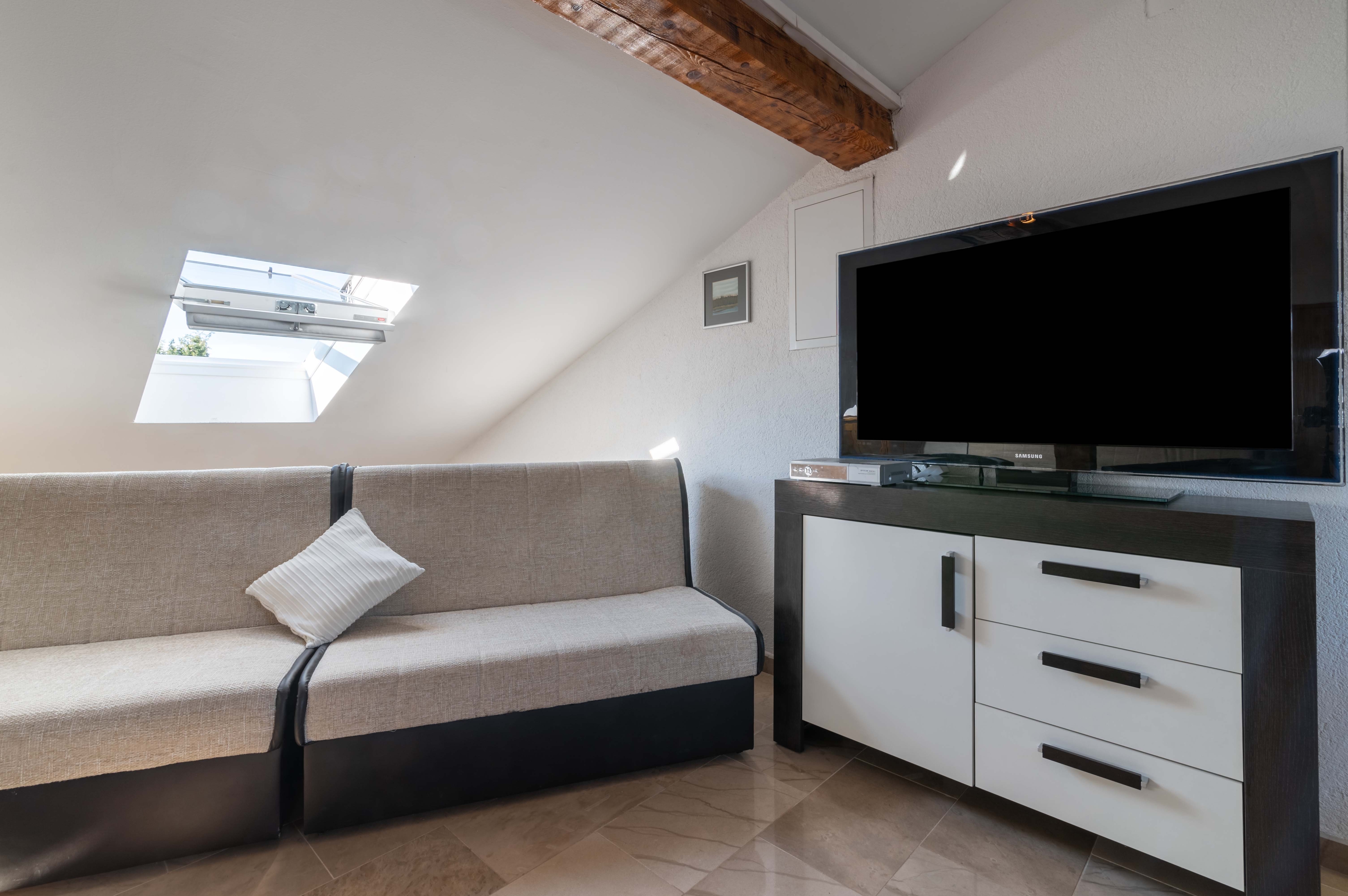 Studio flat can accommodate 3 guests. Beds are situated in 1 sleeping rooms, but also in the living room, within 60m2. The studio offers the sea view. Food can be prepared using barbecue which is shared with other guests too. Reserved accommodation unit has a shared terrace. INCLUDED IN THE PRICE: tourist tax, final cleaning, air-conditioning, parking, internet, laundry, baby cot, additional bed, iron, ironing board, hairdryer, sunchairs. OPTIONAL ADDITIONAL COSTS: boat (€260.00 per night), bicycle (€20.00 daily (per piece)). The availability of additional services for your chosen dates of stay, as well as their prices (if none are listed) must be checked ahead of time. Any additional services not shown in the price calculation are payable directly to the property owner and only if used by the visitor.